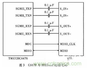 C6678和PHY芯片88E1111的接口電路如圖3所示。88E1111工作在SGMII接口模式下,不需要TXCLK時(shí)鐘輸入,更有助于減少電路板上走線的數(shù)量,同時(shí)也可減少噪聲的產(chǎn)生。