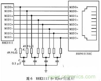 88E1111和網(wǎng)絡(luò)介質(zhì)之間無法直接連接,因傳輸速度在千兆級(jí),所以更加需要設(shè)計(jì)合適的網(wǎng)絡(luò)隔離變壓器來降低傳輸損耗、回音和串?dāng)_。本文選擇千兆網(wǎng)口插座HR911130C,該插座內(nèi)部自帶變壓器電路,只需在外部連接濾波網(wǎng)絡(luò)便可實(shí)現(xiàn)網(wǎng)絡(luò)信號(hào)穩(wěn)定地傳輸,如圖6所示。88E1111和 HR9111130C采用差分連接,在PCB布線時(shí)需要嚴(yán)格等長,且一般還需使用阻抗匹配網(wǎng)絡(luò),如圖6中的R1和C1。