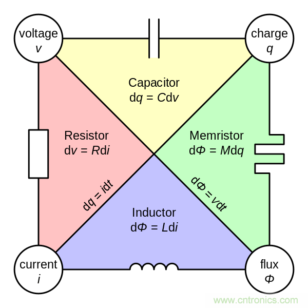 ▲ 電阻器、電容器、電感器和憶阻器概念之間的對(duì)稱(chēng)性。