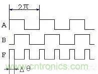 從表1可知,如果輸入端A和B分別送入占空比為50%的信號波形, 則當兩者存在相位差Dθ時,輸出端F的波形的占空比與Δθ有關,見圖3。將F輸出波形通過積分器平滑,則積分器輸出波形的平均值,它同樣與Δθ有關,這樣,我們就可以利用異或門來進行相位到電壓的轉換,構成相位檢出電路。于是經(jīng)積分器積分后的平均值(直流分量)為:U = Vdd * Δ θ/π (1)