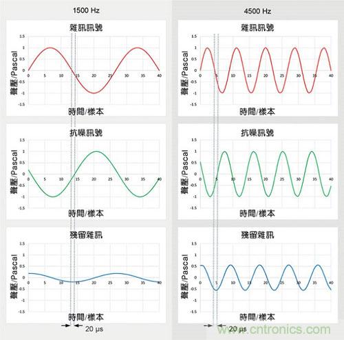 前饋降噪帶寬,在低頻處被耳機驅動模塊限制在50Hz左右,在高頻處被聲學結構和訊號處理延遲限制于3kHz。延遲會導致難以在抗噪訊號和噪聲訊號之間實現(xiàn)180度的相位反轉,高頻部份因為波長較短更難處理。圖2顯示了兩種頻率下20μs延遲對降噪效果的影響:頻率為1500Hz時,殘余噪聲約剩1/5(14dB ANC),但頻率為4500Hz時,即使延遲不變,殘余噪聲也已增加到3/5(僅4dB ANC)。