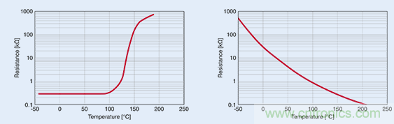 圖1:正溫度系數(shù) (PTC) 和負(fù)溫度系數(shù) (NTC) 熱敏電阻的電阻特性
