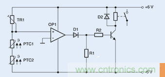 至于TR1,在設(shè)置時(shí),其最大值應(yīng)約等于常溫電阻的兩倍。而TR1還能夠相應(yīng)地進(jìn)行微調(diào)。在冷態(tài)下,非反相輸入端將出現(xiàn)電位,而這一電位相比反相輸入端電位則具有較高的負(fù)電位。這則意味著比較器輸出端出現(xiàn)負(fù)電壓。若某一個(gè)或兩個(gè)正溫度系數(shù) (PTC) 傳感器達(dá)到相應(yīng)的溫度限值,則分壓器的電位將出現(xiàn)變化,而比較器則將進(jìn)行切換,并發(fā)送一個(gè)正輸出信號(hào),進(jìn)而切斷晶體管。