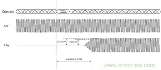 開(kāi)關(guān)時(shí)間(Switch Time)或切換時(shí)間指的是開(kāi)關(guān)從“導(dǎo)通”狀態(tài)轉(zhuǎn)變?yōu)?ldquo;截止”狀態(tài)或者從“截止”狀態(tài)轉(zhuǎn)變?yōu)?ldquo;導(dǎo)通”狀態(tài)所需要的時(shí)間。具體來(lái)講是指從DUT接收到通道切換命令,到在被切換到的通道上信號(hào)的功率達(dá)到滿幅度值的90%的時(shí)間。