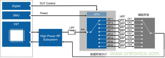 在量產(chǎn)測(cè)試中,信號(hào)分析儀相對(duì)較高,因此依然可以使用矢量信號(hào)收發(fā)儀搭配高功率模塊來(lái)實(shí)現(xiàn),最大化復(fù)用之前測(cè)試項(xiàng)所使用的儀器。