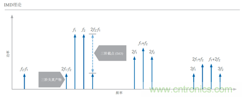 為了理解IMD,我們需要回顧一下非線性系統(tǒng)的多音信號(hào)理論。雖然單音激勵(lì)信號(hào)會(huì)在該信號(hào)頻率的每個(gè)倍數(shù)處產(chǎn)生諧波行為,但是多音信號(hào)產(chǎn)生的非線性產(chǎn)物需要在更寬的頻率范圍才會(huì)出現(xiàn)。