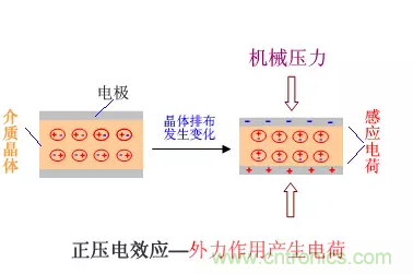 對具有壓電特性的介質(zhì)材料施加機械壓力,介質(zhì)晶體會發(fā)生結(jié)構(gòu)重組排布,材料表面會感應(yīng)出電荷,產(chǎn)生電位差。