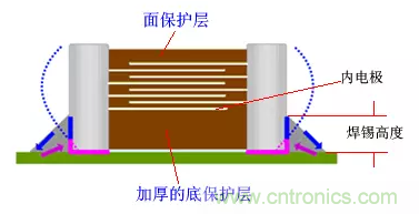 由于保護層厚度部分是沒有內(nèi)電極的,這部分的BaTiO3陶瓷不會發(fā)生形變,當兩端的焊錫高度不超過底保護層厚度,這時產(chǎn)生的形變對PCB影響要小,有效地降低噪聲。