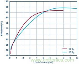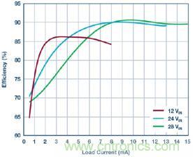 圖 2:圖 1 所示轉(zhuǎn)換器在各種不同輸入電壓條件下的效率。