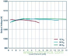 有關(guān) LT8304-1 周圍組件所承受之電壓和電流應(yīng)力計算的說明,詳見 LT8304-1 的數(shù)據(jù)手冊。值得注意的是,這款 1000 V 解決方案采用了一個在副邊具有 3 個分離輸出繞組的變壓器。原邊至副邊匝數(shù)比為 1:10:10:10,而不是單副邊繞組 1:30 匝數(shù)比變壓器。1:10:10:10 變壓器使得輸出電壓應(yīng)力可在 3 個高電壓輸出二極管和 3 個高電壓輸出電容器之間分擔(dān)。單個組件的電壓額定值只需為總電壓的 1/3,因而有利于獲得更多可供選擇的輸出二極管和輸出電容器。圖 2 顯示這款峰值效率達到 90.5% 的反激式轉(zhuǎn)換器。即使未采用光耦合器,各種不同輸入電壓下的負載調(diào)節(jié)仍然很緊,精度通常為 2% 至 3%,如圖 3 所示。