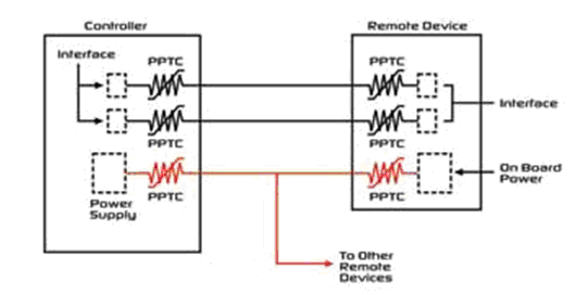 除了控制器,任何遠程傳感器、指示器,或者需要電源的制動器、模擬電路,或者通信總線接口,如果使用PPTC器件,都會給它們帶來益處(見圖3)。這些元件經(jīng)常會因為接錯線路、接錯電源或者中線連接不牢固而造成損壞。