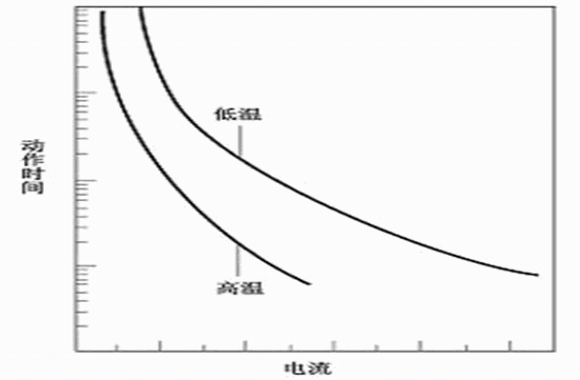 高分子PTC熱敏電阻是一種直熱式、階躍型熱敏電阻,其電阻變化過程與自身的發(fā)熱和散熱情況有關(guān),因而其維持電流(Ihold)、動作電流(Itrip)及動作時間受環(huán)境溫度影響。圖4為熱敏電阻典型的維持電流、動作電流與環(huán)境溫度的關(guān)系示意圖。當(dāng)環(huán)境溫度和電流處于A區(qū)時,熱敏電阻發(fā)熱功率大于散熱功率而會動作;當(dāng)環(huán)境溫度和電流處于B區(qū)時發(fā)熱功率小于散熱功率,熱敏電阻將長期處于不動作狀態(tài);當(dāng)環(huán)境溫度和電流處于C區(qū)時,熱敏電阻的散熱功率與發(fā)熱功率接近,因而可能動作也可能不動作。圖5為熱敏電阻的動作時間與電流及環(huán)境溫度的關(guān)系示意圖。熱敏電阻在環(huán)境溫度相同時,動作時間隨著電流的增加而急劇縮短;熱敏電阻在環(huán)境溫度相對較高時具有更短的動作時間和較小的維持電流及動作電流。