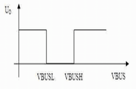 當U- > U+ 時,比較器輸出電平發(fā)生反轉(zhuǎn),由式(1)、(4)、(7)、(8),設此時VBUS的值為VBUSL,有: