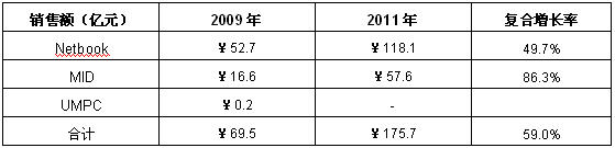 表1 2009-2011年中國超移動(dòng)筆記本電腦市場(chǎng)銷售額預(yù)測(cè)