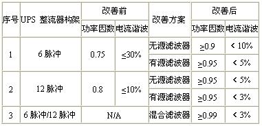 因此,在選擇UPS的同時,必需考慮相應的功率因數及諧波改善措施。目前的主流的UPS的改善主要包括移相、無源濾波器、有源濾波器、混合式濾波幾種方案。其中移相是指在6脈沖整流器基礎上,增加一個移相變壓器后再增加一個6脈沖整流器,可以抑制諧波。機種諧波改善情況如下表所示:
