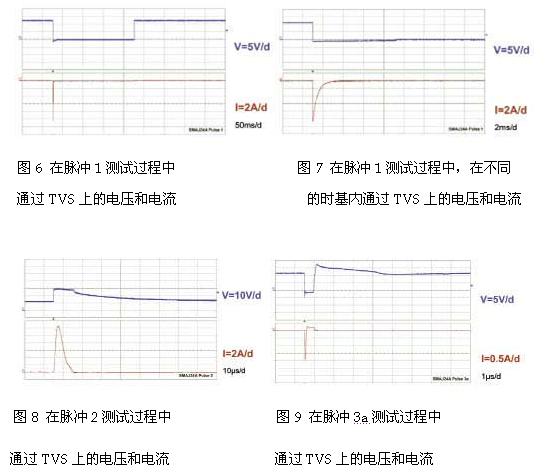 當(dāng)承受圖1中的1、2、3a和3b的脈沖時,該保護(hù)電路的特性如圖6、圖7、圖8、圖9和圖10所示。