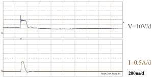 圖10在ISO7637-2脈沖3b測試過程中通過TVS上的電壓和電流