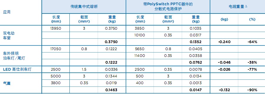 表1給出了與傳統(tǒng)熔斷保護(hù)技術(shù)相比,采用分散式架構(gòu)和PolySwitch器件所能節(jié)省的重量。(注意,如前面所述,本例中使用的最小電線規(guī)格為0.35 mm,而有些應(yīng)用中可以使用規(guī)格更小的電線。)