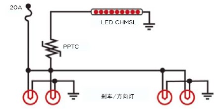 發(fā)光二極管(LED)所具有的低功耗和設(shè)計(jì)靈活性使其在照明電路中的應(yīng)用日益普及,包括中置高位剎車燈(CHMSL)。在這種應(yīng)用中用LED取代白熾燈的好處在于,能使用小規(guī)格低電流導(dǎo)線方便地在車頂內(nèi)襯和靠近鉸鏈處不容易彎曲的連接中輕松地進(jìn)行布線,如圖6所示。采用PolySwitch器件和分散式架構(gòu)保護(hù)LED CHMSL照明應(yīng)用提高了設(shè)計(jì)靈活性,減少了導(dǎo)線數(shù)量和重量并提高了可靠性。