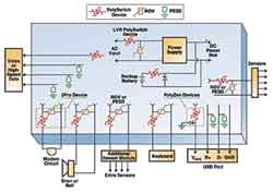圖2描述了一個典型的用于安防和火警系統(tǒng)的電路保護(hù)方案。其中,過流保護(hù)是通過PolySwitchPPTC器件實現(xiàn)的。過壓保護(hù)是通過金屬氧化物變阻器和PESD器件實現(xiàn)的,并且集成了前面所描述保護(hù)設(shè)備I/O端口的PolyZen和2Pro器件。