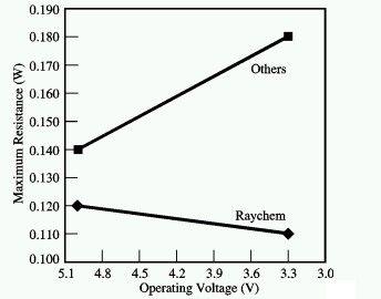 在USB的設(shè)計(jì)中,另一項(xiàng)重要的考慮因素是隨著電壓的下降,電阻值也會下降。隨著供電電壓的下降,電壓降問題顯得更加突出。一般來說,電壓下降將導(dǎo)致電源開關(guān)的導(dǎo)通電阻增加,這是一種不期望的特性。但Raychem的PowerSwitch元件的電阻卻能夠隨著供電電壓的下降而下降,因而避免這不利特性。如圖7所示,在匯流排電壓較高時,PowerSwitch能夠減少輸出電流值,提升電源的效率和電池的使用壽命。在匯流排電壓較低時,PowerSwitch兩端的電壓降也會降低,這樣USB功能就能繼續(xù)工作一段更長的時間。