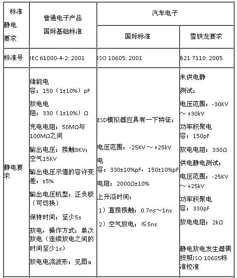 靜電問題對電子設(shè)備來說是必須考慮和預(yù)防的。為了防止電子設(shè)備在靜電干擾時出現(xiàn)產(chǎn)生不必要的誤動作,因此各個國家、各行業(yè)也都對于相關(guān)的電子設(shè)備做出了靜電測試(ESD)要求。本文就以普通電子產(chǎn)品的國際基礎(chǔ)標準要求與汽車電子的國際標準(以雪鐵龍企業(yè)標準為例)做一比較。