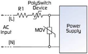 如圖1所示,PolySwitch™PPTC器件可以串聯(lián)在電源輸入端,幫助保護因電路短路、線路過載或者用戶誤操作造成的損壞。另外,在輸入兩端放置金屬氧化物變阻器(MOV)還可提供過壓保護。