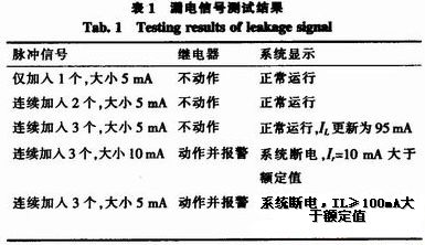 為了測試需要,我們設(shè)計了一個信號源,可以按照系統(tǒng)檢測信號的要求產(chǎn)生脈沖信號,以脈沖信號來模擬漏電信號。設(shè)定緩變電流動作值為100 mA,突變電流動作值為8 mA,當(dāng)緩變電流累計值達(dá)到90 mA時,測試結(jié)果如表1所示。