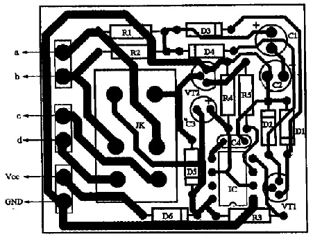 具體制作如下:先把功放輸出端與音箱的引線(xiàn)切斷,按圖2所示電路將引線(xiàn)頭a、b分別接功放的兩組輸出端,c、d分別接左、右聲道音箱:揚(yáng)聲器保護(hù)電路的電源只能從收放機(jī)中獲取,不可直接從汽車(chē)12 v電源中獲取,否則不起開(kāi)/關(guān)機(jī)保護(hù)作用;若是柴油車(chē)所配置的收放機(jī)(使用24 V電源),則要求增加一個(gè)降壓電路(見(jiàn)圖3所示),給揚(yáng)聲器保護(hù)電路供電,以免電源電壓過(guò)高損壞IC。