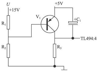 在開關(guān)電源啟動(dòng)時(shí), 由于脈寬調(diào)制器尚未建立穩(wěn)定的驅(qū)動(dòng)脈沖, 需采取措施使得驅(qū)動(dòng)脈沖逐漸建立起來(lái),該開關(guān)電源脈寬調(diào)制器采用性價(jià)比較高的脈寬調(diào)制器T L494。如圖2, TL494 的第四腳為死區(qū)控制,它既可以為變換功率管提供安全的死區(qū)時(shí)間控制, 也可以作為驅(qū)動(dòng)芯片的軟啟動(dòng)控制。開機(jī)瞬間, 電容器C1上未建立電壓, + 5 V 通過(guò)電容C1 送TL494: 4 腳, 封鎖脈寬調(diào)制器的輸出脈沖。隨著電容C1 兩端電壓逐漸升高, T L494: 4 腳電壓逐漸下降, 驅(qū)動(dòng)脈沖寬度逐漸展寬。當(dāng)輔助電源+ 15 V 出現(xiàn)故障時(shí), 三級(jí)管V1迅速導(dǎo)通, + 5 V 電壓經(jīng)三極管V1 送T L494: 4 腳, 切斷驅(qū)動(dòng)脈沖, 使開關(guān)電源停止工作而不致?lián)p壞。