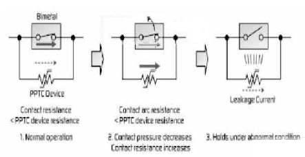 由于雙金屬觸點(diǎn)的低接觸阻抗,在正常操作下電流會流經(jīng)雙金屬觸點(diǎn)。當(dāng)出現(xiàn)諸如電動工具轉(zhuǎn)子鎖定這樣的異常事件時,電路中就會產(chǎn)生更高的電流,使雙金屬觸點(diǎn)打開,其接觸電阻也隨之升高。此時,電流就會分流到具備更低阻抗的PPTC器件上,同時也加熱雙金屬,使其打開并保持在鎖定的狀態(tài), 從而有助于防止各觸點(diǎn)之間電弧的產(chǎn)生。請參考圖2。