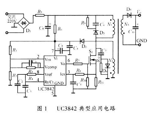 UC3842的典型應(yīng)用電路如圖l所示。該電路主要由橋式整流電路,高頻變壓器,MOS功率管以及電流型脈寬調(diào)制芯片UC3842構(gòu)成。其工作原理為:220V的交流電經(jīng)過橋式整流濾波電路后,得到大約+300V的直流高壓,這一直流電壓被M0S功率管斬波并通過高頻變壓器降壓,變成頻率為幾十kHz的矩形波電壓,再經(jīng)過輸出整流濾波,就得到了穩(wěn)定的直流輸出電壓。其中高頻變壓器的自饋線圈N2中感應(yīng)的電壓,經(jīng)D2整流后所得到的直流電壓被反饋到UC3842內(nèi)部的誤差放大器并和基準(zhǔn)電壓比較得到誤差電壓Vr,同時在取樣電阻R11上建立的直流電壓也被反饋到UC3842電流測定比較器的同柑輸入端,這個檢測電壓和誤差電壓