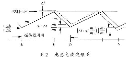 在圖l所示的電路中,當(dāng)電源的占空比大于50%,或變壓器工作在連續(xù)電流條件下時,整個電路就會產(chǎn)生分諧波振蕩,引起電源輸出的不穩(wěn)定。圖2表示了變壓器中電感電流的變化過程。沒在t0時刻,開關(guān)開始導(dǎo)通,使電感電流以斜率m1上升,該斜率是輸入電壓除以電感的函數(shù)。t1時刻,電流取樣輸入達到由控制電壓建立的門限,這導(dǎo)致開關(guān)斷開,電流以斜率m2衰減,直至下一個振蕩周期。如果此時有一個擾動加到控制電壓上,那么它將產(chǎn)生一個△I,這樣我們就會發(fā)現(xiàn)電路存在著不穩(wěn)定的情況,即在一個固定的振蕩器周期內(nèi),電流衰減時閘減少,最小電流開關(guān)接通時刻t2上升了△I+△Im2/m1,最小電流在下一個周期t3減小到(△I+△Im2/m4)(m2/m1),在每一個后續(xù)周期,該擾動m2/m1被相乘,在開關(guān)接通時交替增加和減小電感電流,也許需要幾個振蕩器周期才能使電感電流為零,使過程重新開始,如果m2/m1大于l,將會不穩(wěn)定。因此,圖l所示的電路在某狀態(tài)下存在著一定的失穩(wěn)隱患?! ?/p>