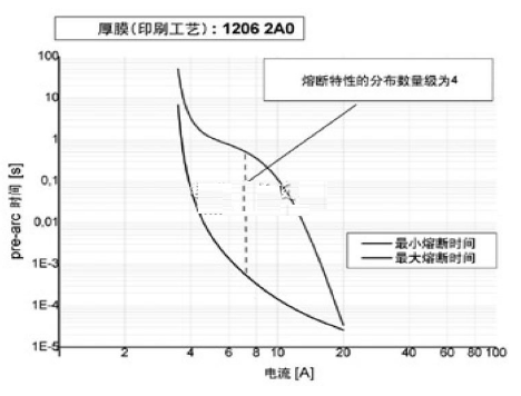 在設(shè)計(jì)階段,電子工程師會碰到熔斷特性大幅變化的情況。一般來說,貼片式保險絲是低阻值的電阻,其阻值只有幾歐姆。如上所述,熔融特性與電阻值有關(guān)。如果電阻值的變化范圍很大,熔融特性也就相應(yīng)地有很大變化。由于這種可能發(fā)生的變化,貼片式保險絲在碰到正常的涌流時就斷開,或是相反,在過載情況下,應(yīng)該斷開時卻不斷開,這種最糟糕的情形是工程師必須避免的。圖3所示為印刷厚膜保險絲的熔斷特性典型分布。