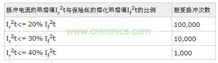 每次脈沖沖擊保險(xiǎn)絲,保險(xiǎn)絲都會(huì)受到一定的損傷,經(jīng)過多次反復(fù)沖擊保險(xiǎn)絲就會(huì)熔斷。以下為AEM產(chǎn)品耐受沖擊次數(shù)的表格: