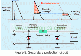 MOSFET的柵極在-1V或更低的反向電壓下也很脆弱。在反向電源輸入模式中,電源線的電壓域TVS VF的電壓相同。這種反向偏置模式會引起電子線路的故障。EPI PAR TVS的低正向壓降能夠很好地解決這個問題。保護電路免受反向電源輸入損害的另一個方法是在電源線中放一個極性保護整流器,如圖8所示。極性保護整流器應該有足夠的正向電流等級,以及正向浪涌和反向電壓性能。