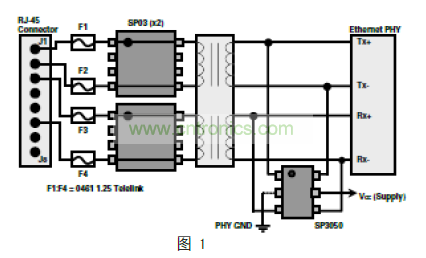 任何線路端保護(hù)裝置(這個(gè)例子中的 SP03A)不能有 GND引腳(2、3、6 和 7)連接到 GND,以保證符合 IEEE802.3隔離標(biāo)準(zhǔn);因此,設(shè)計(jì)師沒(méi)有選擇,只能將此設(shè)備作為“異模”保護(hù)器。(注:當(dāng)然,這使得驅(qū)動(dòng)端保護(hù)元件成為必要,以保護(hù)系統(tǒng)免受共模事件損壞。)