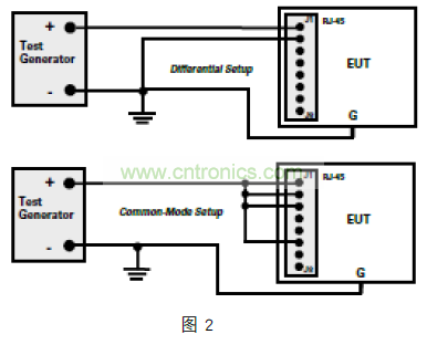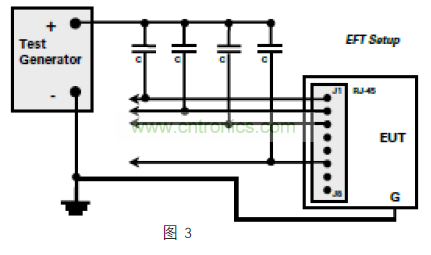 檢查設(shè)備的 EFT 免疫力(根據(jù) IEC61000-4-4 標(biāo)準(zhǔn)),與共模雷擊浪涌測(cè)試非常相似。在如圖 3 所示比較典型的配置中,所有的導(dǎo)體(或引腳)電容耦合到測(cè)試信號(hào)發(fā)生器的正極和“浪涌”到 GND。如果數(shù)據(jù)線幾乎沒(méi)有差別,線對(duì)之間很少有異模能量,但變壓器耦合電容會(huì)再次將共模能量以衰減的方式傳輸?shù)津?qū)動(dòng)端。