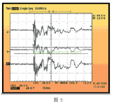 另一個(gè)要了解的重要因素是 CDE 波形,因?yàn)樗幌褚郧坝懻摰娜魏瓮{,取決于耦合機(jī)制,要么是異模,要么是共模。此外,初步研究顯示,它在特點(diǎn)上有很大差異,但總體上看,CDE 的波形能量高,體現(xiàn)在電壓和電流驅(qū)動(dòng)上。波形傳播的時(shí)間為幾百納秒,能夠快速反轉(zhuǎn)極性。下面的圖 5,給出了破壞性 CDE 波形的例子,在一個(gè)以太網(wǎng) PHY 發(fā)射器引腳,一個(gè) 25 英尺雙絞線電纜靜電電壓達(dá) 1.5KV。在該事件發(fā)生超過(guò) 600ns 時(shí)間的期間,在異模波形上看到有 64.8V 從正電壓轉(zhuǎn)換為負(fù)電壓。在這個(gè)實(shí)驗(yàn)中,PHY 的發(fā)射器被破壞,無(wú)法在網(wǎng)絡(luò)上傳輸數(shù)據(jù)包。