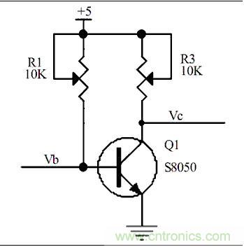 2、當我們調(diào)節(jié)可調(diào)電阻,R1,使R1=4.3K時,通過歐姆定律我們可以計算得到,Ib=(5-0.7)/4.3K=1mA,那我們就可以計算出IC=Hfe*Ib=10mA,假如這個時候我調(diào)節(jié)R3,使R3=1K歐姆,通過計算我們可以得到Vc=5-(10mA*1K)=-5V,回出現(xiàn)-5V嗎,當然不會,因為沒有負壓,所以Vc的電壓會停留在0V,那這個時候我們再來看下Ic到底是多少?