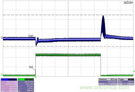 圖3展示了對0.9V輸出(被15A的負載階躍以300A/us的速率擾動)的瞬態(tài)響應。