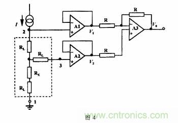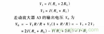 恒流源電流I通過(guò)饋線2流入被測(cè)電阻,饋線1接地,饋線2和3分別接運(yùn)放A1和A2的輸入端。若兩運(yùn)放的增益都為1,其輸出電壓V1和V2為: