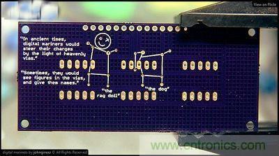 下面是一位自稱“johngineer”的網(wǎng)友作品,這家伙的網(wǎng)站有不少很酷的東西(例如一只他自 己做的超酷龐克風手表),還有非常專業(yè)的技術(shù)文章。“johngineer”沒有解釋這個電路板的作用,但他在上面印了兩段文字,想象未來如果有考古學家挖到這片電路板,會怎么解讀這種“文物”?