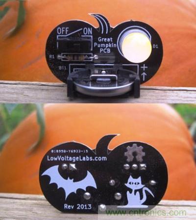 這是low voltage labs開發(fā)的南瓜PCB,除了形狀很可愛,還印了可愛的圖案;這款電路板上面有LED燈泡,就是讓你在萬圣節(jié)放進南瓜燈,不必擔心蠟燭會被風吹熄….其實直接當成擺飾也很有味道,而且只要6美元就買得到!