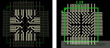 圖7a和7b:焊盤(pán)內(nèi)過(guò)孔用于內(nèi)部,而外部引腳在0.5mm柵格上扇出。圖7a顯示的是頂層;圖7b顯示的是頂層和內(nèi)部布線(xiàn)層。