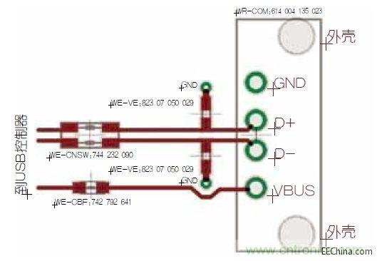 從圖3可以明顯看出,有兩條差分信號線(D+和D-)從插頭連接器連接到TVS二極管,再通過電流補(bǔ)償式數(shù)據(jù)線扼流圈連接到USB控制器。這樣能夠得到出色的靜電放電保護(hù)功能,并能良好的抑制數(shù)據(jù)線對。VBUS通過TVS二極管路由到貼片磁珠。在貼片磁珠之后,可以插入額外的電容和另一個(gè)貼片磁珠來實(shí)現(xiàn)最大可能的PI濾波器衰減。