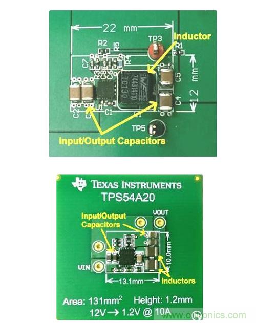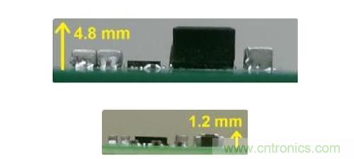 穩(wěn)壓器尺寸的減小為我們提供了更多的機會。對比圖2中所示的高度剖面圖我們可以看到,常規(guī)降壓變換器的高度為4.8毫米,然而對于背面部件而言,這一高度遠超很多系統(tǒng)的高度限制。串聯(lián)電容降壓轉(zhuǎn)換器(1.2毫米高)的低斷面可以讓您將穩(wěn)壓器置于電路板背面,這樣便可以釋放寶貴的頂側(cè)基板面。之前將整個10A轉(zhuǎn)換器置于其背面在之前不太現(xiàn)實,因為無源部件體積過大, 但如今有了TPS54A20,一切便成了可能。