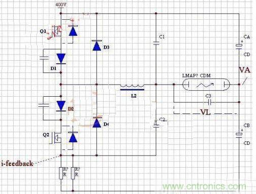 再講時序,當(dāng)換相,如:Q1停,輪到Q2工作的瞬間,當(dāng)Q2開,此時L2上的壓降是200V(VA)+VL,慢慢過渡到200V(VA)-VL。這個瞬間給C2放電的電流并不經(jīng)過電流采樣電阻,隨電功率大,C2容量也大,小功率時可以靠Q2硬撐,大功率時,幾十安的沖擊電流如何能撐?在這種拓?fù)淅?,為了兼顧電流采樣的有效性C3遠(yuǎn)遠(yuǎn)小于C1C2。