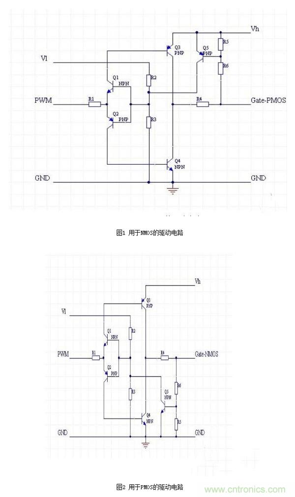 這里我只針對NMOS驅(qū)動電路做一個簡單分析:Vl和Vh分別是低端和高端的電源,兩個電壓可以是相同的,但是Vl不應(yīng)該超過Vh。Q1和Q2組成了一個反置的圖騰柱,用來實現(xiàn)隔離,同時確保兩只驅(qū)動管Q3和Q4不會同時導(dǎo)通。 R2和R3提供了PWM電壓基準(zhǔn),通過改變這個基準(zhǔn),可以讓電路工作在PWM信號波形比較陡直的位置。 Q3和Q4用來提供驅(qū)動電流,由于導(dǎo)通的時候,Q3和Q4相對Vh和GND最低都只有一個Vce的壓降,這個壓降通 常只有0.3V左右,大大低于0.7V的Vce。 R5和R6是反饋電阻,用于對gate電壓進(jìn)行采樣,采樣后的電壓通過Q5對Q1和Q2的基極產(chǎn)生一個強(qiáng)烈的負(fù)反饋, 從而把gate電壓限制在一個有限的數(shù)值。這個數(shù)值可以通過R5和R6來調(diào)節(jié)。