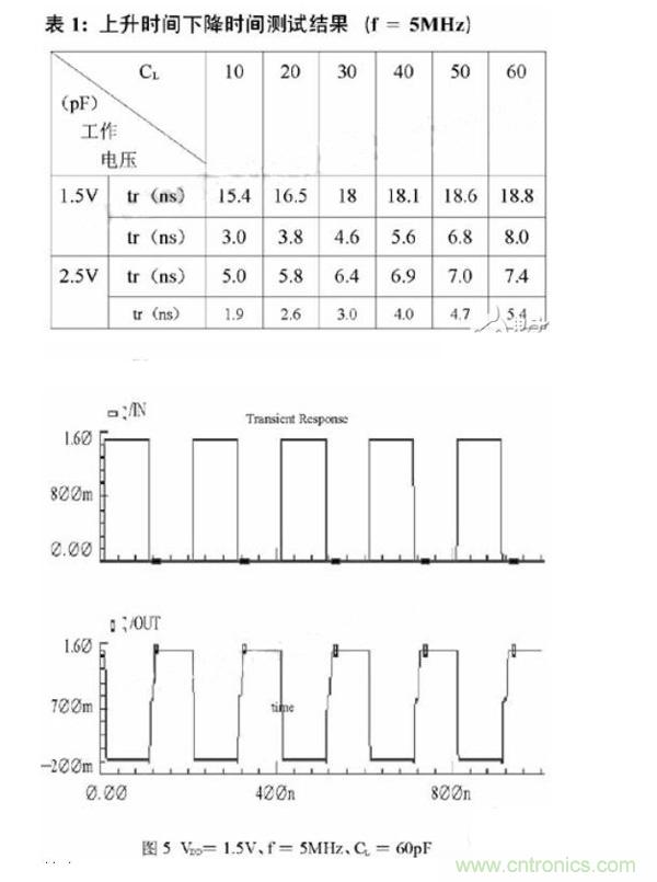 結(jié)合表1和圖5可以看出,此驅(qū)動電路能夠在工作電壓為1.5V,工作頻率為5MHz,并且負(fù)載電容高達(dá)60pF的條件下正常工作。它可以應(yīng)用于低電壓、高工作頻率的DC-DC轉(zhuǎn)換器中作為開關(guān)管的驅(qū)動電路。